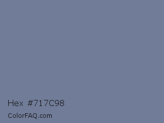 Hex #717c98 Color is a normal blue color and the nearest color is Lynch #697e9a. Hex code #717c98 and RGB value is rgb(113,124,152). In RGB color space, this color is composed of 44% red, 49% green, 60% blue, In CMYK color space, this color is composed of 26% cyan, 18% magenta, 0% yellow , 40% black , In HSL color space, this color has a hue angle of 223° , 16% saturation and 52% lightness.
