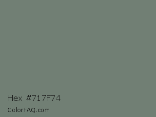 Hex #717f74 Color is a normal green color and the nearest color is Smoke #738276. Hex code #717f74 and RGB value is rgb(113,127,116). In RGB color space, this color is composed of 44% red, 50% green, 45% blue, In CMYK color space, this color is composed of 11% cyan, 0% magenta, 9% yellow , 50% black , In HSL color space, this color has a hue angle of 133° , 6% saturation and 47% lightness.
