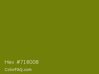 Hex #718008 Color is a dark yellow color and the nearest color is Olive #808000. Hex code #718008 and RGB value is rgb(113,128,8). In RGB color space, this color is composed of 44% red, 50% green, 3% blue, In CMYK color space, this color is composed of 12% cyan, 0% magenta, 94% yellow , 50% black , In HSL color space, this color has a hue angle of 68° , 88% saturation and 27% lightness.