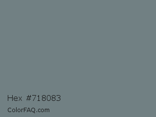 Hex #718083 Color is a normal cyan color and the nearest color is Sirocco #718080. Hex code #718083 and RGB value is rgb(113,128,131). In RGB color space, this color is composed of 44% red, 50% green, 51% blue, In CMYK color space, this color is composed of 14% cyan, 2% magenta, 0% yellow , 49% black , In HSL color space, this color has a hue angle of 190° , 7% saturation and 48% lightness.