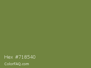 Hex #718540 Color is a normal lime color and the nearest color is Palm Leaf #6f9940. Hex code #718540 and RGB value is rgb(113,133,64). In RGB color space, this color is composed of 44% red, 52% green, 25% blue, In CMYK color space, this color is composed of 15% cyan, 0% magenta, 52% yellow , 48% black , In HSL color space, this color has a hue angle of 77° , 35% saturation and 39% lightness.