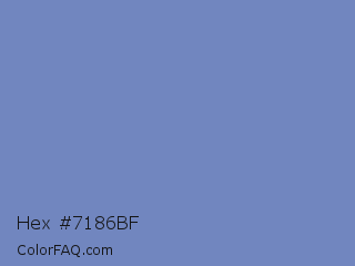 Hex #7186bf Color is a normal blue color and the nearest color is Ship Cove #788bba. Hex code #7186bf and RGB value is rgb(113,134,191). In RGB color space, this color is composed of 44% red, 53% green, 75% blue, In CMYK color space, this color is composed of 41% cyan, 30% magenta, 0% yellow , 25% black , In HSL color space, this color has a hue angle of 224° , 38% saturation and 60% lightness.