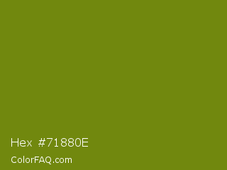Hex #71880e Color is a dark lime color and the nearest color is Trendy Green #7c881a. Hex code #71880e and RGB value is rgb(113,136,14). In RGB color space, this color is composed of 44% red, 53% green, 5% blue, In CMYK color space, this color is composed of 17% cyan, 0% magenta, 90% yellow , 47% black , In HSL color space, this color has a hue angle of 71° , 81% saturation and 29% lightness.