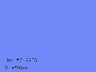Hex #7188f8 Color is a light blue color and the nearest color is Cornflower Blue #6495ed. Hex code #7188f8 and RGB value is rgb(113,136,248). In RGB color space, this color is composed of 44% red, 53% green, 97% blue, In CMYK color space, this color is composed of 54% cyan, 45% magenta, 0% yellow , 3% black , In HSL color space, this color has a hue angle of 230° , 91% saturation and 71% lightness.