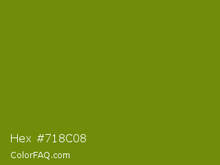 Hex #718c08 Color is a dark lime color and the nearest color is Limeade #6f9d02. Hex code #718c08 and RGB value is rgb(113,140,8). In RGB color space, this color is composed of 44% red, 55% green, 3% blue, In CMYK color space, this color is composed of 19% cyan, 0% magenta, 94% yellow , 45% black , In HSL color space, this color has a hue angle of 72° , 89% saturation and 29% lightness.