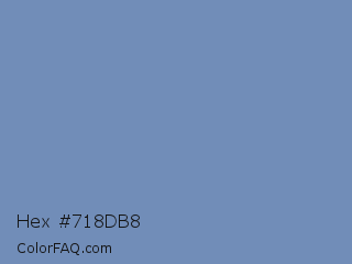 Hex #718db8 Color is a normal blue color and the nearest color is Ship Cove #788bba. Hex code #718db8 and RGB value is rgb(113,141,184). In RGB color space, this color is composed of 44% red, 55% green, 72% blue, In CMYK color space, this color is composed of 39% cyan, 23% magenta, 0% yellow , 28% black , In HSL color space, this color has a hue angle of 216° , 33% saturation and 58% lightness.