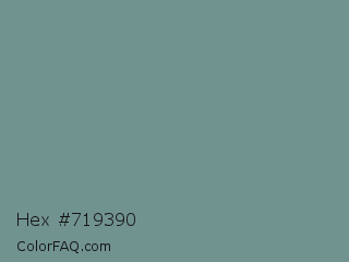 Hex #719390 Color is a normal cyan color and the nearest color is Juniper #6d9292. Hex code #719390 and RGB value is rgb(113,147,144). In RGB color space, this color is composed of 44% red, 58% green, 56% blue, In CMYK color space, this color is composed of 23% cyan, 0% magenta, 2% yellow , 42% black , In HSL color space, this color has a hue angle of 175° , 14% saturation and 51% lightness.