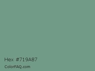 Hex #719a87 Color is a normal green color and the nearest color is Oxley #779e86. Hex code #719a87 and RGB value is rgb(113,154,135). In RGB color space, this color is composed of 44% red, 60% green, 53% blue, In CMYK color space, this color is composed of 27% cyan, 0% magenta, 12% yellow , 40% black , In HSL color space, this color has a hue angle of 152° , 17% saturation and 52% lightness.