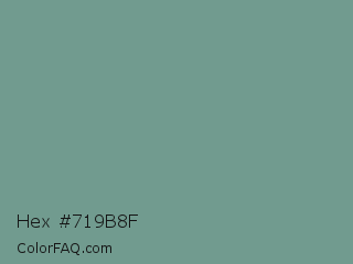 Hex #719b8f Color is a normal green color and the nearest color is Juniper #6d9292. Hex code #719b8f and RGB value is rgb(113,155,143). In RGB color space, this color is composed of 44% red, 61% green, 56% blue, In CMYK color space, this color is composed of 27% cyan, 0% magenta, 8% yellow , 39% black , In HSL color space, this color has a hue angle of 163° , 17% saturation and 53% lightness.
