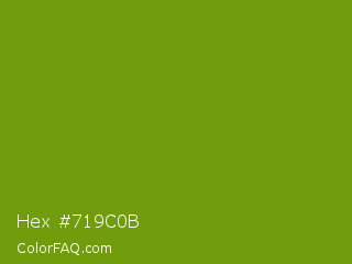 Hex #719c0b Color is a normal lime color and the nearest color is Limeade #6f9d02. Hex code #719c0b and RGB value is rgb(113,156,11). In RGB color space, this color is composed of 44% red, 61% green, 4% blue, In CMYK color space, this color is composed of 28% cyan, 0% magenta, 93% yellow , 39% black , In HSL color space, this color has a hue angle of 78° , 87% saturation and 33% lightness.