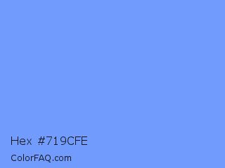 Hex #719cfe Color is a light blue color and the nearest color is Cornflower Blue #6495ed. Hex code #719cfe and RGB value is rgb(113,156,254). In RGB color space, this color is composed of 44% red, 61% green, 100% blue, In CMYK color space, this color is composed of 56% cyan, 39% magenta, 0% yellow , 0% black , In HSL color space, this color has a hue angle of 222° , 99% saturation and 72% lightness.