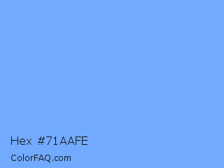 Hex #71aafe Color is a light blue color and the nearest color is French Sky Blue #77b5fe. Hex code #71aafe and RGB value is rgb(113,170,254). In RGB color space, this color is composed of 44% red, 67% green, 100% blue, In CMYK color space, this color is composed of 56% cyan, 33% magenta, 0% yellow , 0% black , In HSL color space, this color has a hue angle of 216° , 99% saturation and 72% lightness.