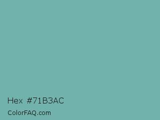 Hex #71b3ac Color is a normal cyan color and the nearest color is Green Sheen #6eaea1. Hex code #71b3ac and RGB value is rgb(113,179,172). In RGB color space, this color is composed of 44% red, 70% green, 67% blue, In CMYK color space, this color is composed of 37% cyan, 0% magenta, 4% yellow , 30% black , In HSL color space, this color has a hue angle of 174° , 30% saturation and 57% lightness.