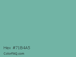 Hex #71b4a5 Color is a normal cyan color and the nearest color is Green Sheen #6eaea1. Hex code #71b4a5 and RGB value is rgb(113,180,165). In RGB color space, this color is composed of 44% red, 71% green, 65% blue, In CMYK color space, this color is composed of 37% cyan, 0% magenta, 8% yellow , 29% black , In HSL color space, this color has a hue angle of 167° , 31% saturation and 57% lightness.