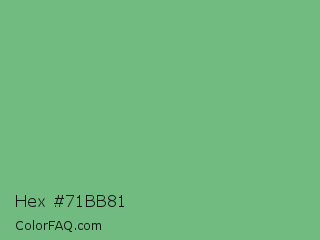 Hex #71bb81 Color is a normal green color and the nearest color is Iguana Green #71bc78. Hex code #71bb81 and RGB value is rgb(113,187,129). In RGB color space, this color is composed of 44% red, 73% green, 51% blue, In CMYK color space, this color is composed of 40% cyan, 0% magenta, 31% yellow , 27% black , In HSL color space, this color has a hue angle of 133° , 35% saturation and 59% lightness.