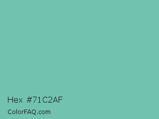 Hex #71c2af Color is a normal cyan color and the nearest color is Neptune #7cb7bb. Hex code #71c2af and RGB value is rgb(113,194,175). In RGB color space, this color is composed of 44% red, 76% green, 69% blue, In CMYK color space, this color is composed of 42% cyan, 0% magenta, 10% yellow , 24% black , In HSL color space, this color has a hue angle of 166° , 40% saturation and 60% lightness.