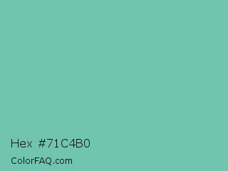 Hex #71c4b0 Color is a light cyan color and the nearest color is Neptune #7cb7bb. Hex code #71c4b0 and RGB value is rgb(113,196,176). In RGB color space, this color is composed of 44% red, 77% green, 69% blue, In CMYK color space, this color is composed of 42% cyan, 0% magenta, 10% yellow , 23% black , In HSL color space, this color has a hue angle of 166° , 41% saturation and 61% lightness.