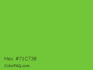 Hex #71c738 Color is a normal green color and the nearest color is Green RYB #66b032. Hex code #71c738 and RGB value is rgb(113,199,56). In RGB color space, this color is composed of 44% red, 78% green, 22% blue, In CMYK color space, this color is composed of 43% cyan, 0% magenta, 72% yellow , 22% black , In HSL color space, this color has a hue angle of 96° , 56% saturation and 50% lightness.