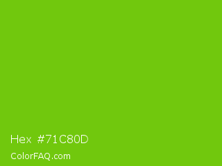 Hex #71c80d Color is a normal green color and the nearest color is Lima #76bd17. Hex code #71c80d and RGB value is rgb(113,200,13). In RGB color space, this color is composed of 44% red, 78% green, 5% blue, In CMYK color space, this color is composed of 44% cyan, 0% magenta, 94% yellow , 22% black , In HSL color space, this color has a hue angle of 88° , 88% saturation and 42% lightness.