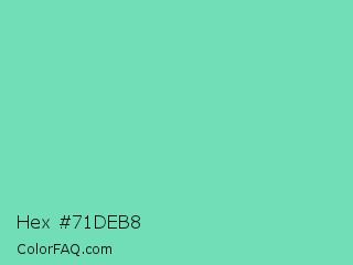Hex #71deb8 Color is a light green color and the nearest color is Medium Aquamarine #66ddaa. Hex code #71deb8 and RGB value is rgb(113,222,184). In RGB color space, this color is composed of 44% red, 87% green, 72% blue, In CMYK color space, this color is composed of 49% cyan, 0% magenta, 17% yellow , 13% black , In HSL color space, this color has a hue angle of 159° , 62% saturation and 66% lightness.