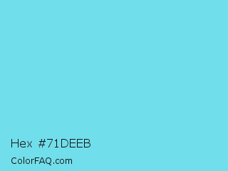 Hex #71deeb Color is a light cyan color and the nearest color is Turquoise Blue #6cdae7. Hex code #71deeb and RGB value is rgb(113,222,235). In RGB color space, this color is composed of 44% red, 87% green, 92% blue, In CMYK color space, this color is composed of 52% cyan, 6% magenta, 0% yellow , 8% black , In HSL color space, this color has a hue angle of 186° , 75% saturation and 68% lightness.