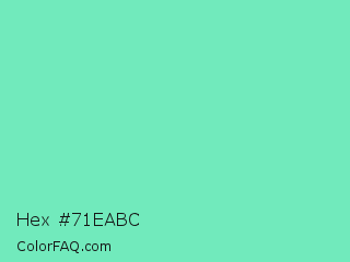 Hex #71eabc Color is a light green color and the nearest color is Bermuda #7dd8c6. Hex code #71eabc and RGB value is rgb(113,234,188). In RGB color space, this color is composed of 44% red, 92% green, 74% blue, In CMYK color space, this color is composed of 52% cyan, 0% magenta, 20% yellow , 8% black , In HSL color space, this color has a hue angle of 157° , 74% saturation and 68% lightness.