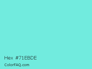 Hex #71ebde Color is a light cyan color and the nearest color is Aquamarine Blue #71d9e2. Hex code #71ebde and RGB value is rgb(113,235,222). In RGB color space, this color is composed of 44% red, 92% green, 87% blue, In CMYK color space, this color is composed of 52% cyan, 0% magenta, 6% yellow , 8% black , In HSL color space, this color has a hue angle of 174° , 75% saturation and 68% lightness.