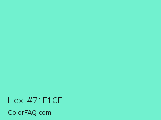 Hex #71f1cf Color is a light cyan color and the nearest color is Aquamarine #7fffd4. Hex code #71f1cf and RGB value is rgb(113,241,207). In RGB color space, this color is composed of 44% red, 95% green, 81% blue, In CMYK color space, this color is composed of 53% cyan, 0% magenta, 14% yellow , 5% black , In HSL color space, this color has a hue angle of 164° , 82% saturation and 69% lightness.