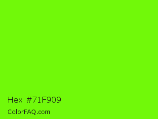 Hex #71f909 Color is a normal green color and the nearest color is Lawn Green #7cfc00. Hex code #71f909 and RGB value is rgb(113,249,9). In RGB color space, this color is composed of 44% red, 98% green, 4% blue, In CMYK color space, this color is composed of 55% cyan, 0% magenta, 96% yellow , 2% black , In HSL color space, this color has a hue angle of 94° , 95% saturation and 51% lightness.