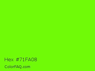 Hex #71fa08 Color is a normal green color and the nearest color is Lawn Green #7cfc00. Hex code #71fa08 and RGB value is rgb(113,250,8). In RGB color space, this color is composed of 44% red, 98% green, 3% blue, In CMYK color space, this color is composed of 55% cyan, 0% magenta, 97% yellow , 2% black , In HSL color space, this color has a hue angle of 94° , 96% saturation and 51% lightness.