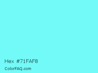 Hex #71faf8 Color is a light cyan color and the nearest color is Electric Blue #7df9ff. Hex code #71faf8 and RGB value is rgb(113,250,248). In RGB color space, this color is composed of 44% red, 98% green, 97% blue, In CMYK color space, this color is composed of 55% cyan, 0% magenta, 1% yellow , 2% black , In HSL color space, this color has a hue angle of 179° , 93% saturation and 71% lightness.