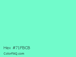 Hex #71fbcb Color is a light green color and the nearest color is Aquamarine #7fffd4. Hex code #71fbcb and RGB value is rgb(113,251,203). In RGB color space, this color is composed of 44% red, 98% green, 80% blue, In CMYK color space, this color is composed of 55% cyan, 0% magenta, 19% yellow , 2% black , In HSL color space, this color has a hue angle of 159° , 95% saturation and 71% lightness.
