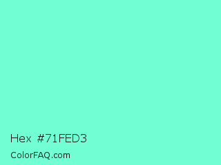 Hex #71fed3 Color is a light green color and the nearest color is Aquamarine #7fffd4. Hex code #71fed3 and RGB value is rgb(113,254,211). In RGB color space, this color is composed of 44% red, 100% green, 83% blue, In CMYK color space, this color is composed of 56% cyan, 0% magenta, 17% yellow , 0% black , In HSL color space, this color has a hue angle of 162° , 99% saturation and 72% lightness.