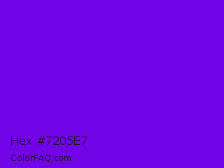Hex #7205e7 Color is a normal violet color and the nearest color is Electric Indigo #6f00ff. Hex code #7205e7 and RGB value is rgb(114,5,231). In RGB color space, this color is composed of 45% red, 2% green, 91% blue, In CMYK color space, this color is composed of 51% cyan, 98% magenta, 0% yellow , 9% black , In HSL color space, this color has a hue angle of 269° , 96% saturation and 46% lightness.