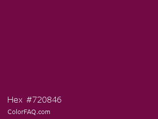 Hex #720846 Color is a dark magenta color and the nearest color is Rose Bud Cherry #800b47. Hex code #720846 and RGB value is rgb(114,8,70). In RGB color space, this color is composed of 45% red, 3% green, 27% blue, In CMYK color space, this color is composed of 0% cyan, 93% magenta, 39% yellow , 55% black , In HSL color space, this color has a hue angle of 325° , 87% saturation and 24% lightness.