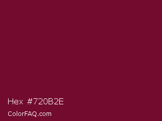 Hex #720b2e Color is a dark rose color and the nearest color is Black Rose #67032d. Hex code #720b2e and RGB value is rgb(114,11,46). In RGB color space, this color is composed of 45% red, 4% green, 18% blue, In CMYK color space, this color is composed of 0% cyan, 90% magenta, 60% yellow , 55% black , In HSL color space, this color has a hue angle of 340° , 82% saturation and 25% lightness.