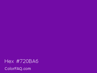 Hex #720ba6 Color is a normal purple color and the nearest color is Purple #660099. Hex code #720ba6 and RGB value is rgb(114,11,166). In RGB color space, this color is composed of 45% red, 4% green, 65% blue, In CMYK color space, this color is composed of 31% cyan, 93% magenta, 0% yellow , 35% black , In HSL color space, this color has a hue angle of 280° , 88% saturation and 35% lightness.