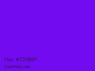 Hex #720bef Color is a normal violet color and the nearest color is Electric Indigo #6f00ff. Hex code #720bef and RGB value is rgb(114,11,239). In RGB color space, this color is composed of 45% red, 4% green, 94% blue, In CMYK color space, this color is composed of 52% cyan, 95% magenta, 0% yellow , 6% black , In HSL color space, this color has a hue angle of 267° , 91% saturation and 49% lightness.