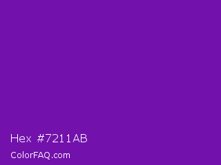 Hex #7211ab Color is a normal purple color and the nearest color is Violet RYB #8601af. Hex code #7211ab and RGB value is rgb(114,17,171). In RGB color space, this color is composed of 45% red, 7% green, 67% blue, In CMYK color space, this color is composed of 33% cyan, 90% magenta, 0% yellow , 33% black , In HSL color space, this color has a hue angle of 278° , 82% saturation and 37% lightness.