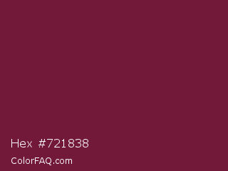 Hex #721838 Color is a dark rose color and the nearest color is Claret #7f1734. Hex code #721838 and RGB value is rgb(114,24,56). In RGB color space, this color is composed of 45% red, 9% green, 22% blue, In CMYK color space, this color is composed of 0% cyan, 79% magenta, 51% yellow , 55% black , In HSL color space, this color has a hue angle of 339° , 65% saturation and 27% lightness.