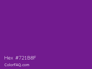 Hex #721b8f Color is a normal purple color and the nearest color is Seance #731e8f. Hex code #721b8f and RGB value is rgb(114,27,143). In RGB color space, this color is composed of 45% red, 11% green, 56% blue, In CMYK color space, this color is composed of 20% cyan, 81% magenta, 0% yellow , 44% black , In HSL color space, this color has a hue angle of 285° , 68% saturation and 33% lightness.
