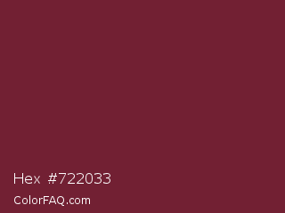 Hex #722033 Color is a dark red color and the nearest color is Wine #722f37. Hex code #722033 and RGB value is rgb(114,32,51). In RGB color space, this color is composed of 45% red, 13% green, 20% blue, In CMYK color space, this color is composed of 0% cyan, 72% magenta, 55% yellow , 55% black , In HSL color space, this color has a hue angle of 346° , 56% saturation and 29% lightness.