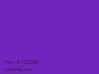 Hex #7225be Color is a normal violet color and the nearest color is Purple Heart Crayola #652dc1. Hex code #7225be and RGB value is rgb(114,37,190). In RGB color space, this color is composed of 45% red, 15% green, 75% blue, In CMYK color space, this color is composed of 40% cyan, 81% magenta, 0% yellow , 25% black , In HSL color space, this color has a hue angle of 270° , 67% saturation and 45% lightness.