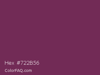 Hex #722b56 Color is a normal magenta color and the nearest color is Finn #692d54. Hex code #722b56 and RGB value is rgb(114,43,86). In RGB color space, this color is composed of 45% red, 17% green, 34% blue, In CMYK color space, this color is composed of 0% cyan, 62% magenta, 25% yellow , 55% black , In HSL color space, this color has a hue angle of 324° , 45% saturation and 31% lightness.