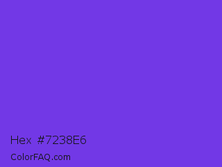 Hex #7238e6 Color is a normal indigo color and the nearest color is Blue Violet #8a2be2. Hex code #7238e6 and RGB value is rgb(114,56,230). In RGB color space, this color is composed of 45% red, 22% green, 90% blue, In CMYK color space, this color is composed of 50% cyan, 76% magenta, 0% yellow , 10% black , In HSL color space, this color has a hue angle of 260° , 78% saturation and 56% lightness.
