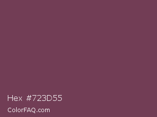 Hex #723d55 Color is a normal rose color and the nearest color is Cosmic #76395d. Hex code #723d55 and RGB value is rgb(114,61,85). In RGB color space, this color is composed of 45% red, 24% green, 33% blue, In CMYK color space, this color is composed of 0% cyan, 46% magenta, 25% yellow , 55% black , In HSL color space, this color has a hue angle of 333° , 30% saturation and 34% lightness.