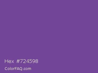 Hex #724598 Color is a normal purple color and the nearest color is Affair #714693. Hex code #724598 and RGB value is rgb(114,69,152). In RGB color space, this color is composed of 45% red, 27% green, 60% blue, In CMYK color space, this color is composed of 25% cyan, 55% magenta, 0% yellow , 40% black , In HSL color space, this color has a hue angle of 273° , 38% saturation and 43% lightness.