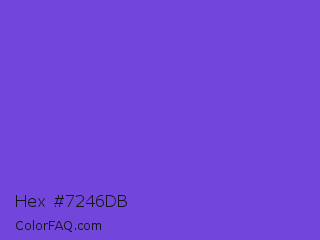 Hex #7246db Color is a normal indigo color and the nearest color is Majorelle Blue #6050dc. Hex code #7246db and RGB value is rgb(114,70,219). In RGB color space, this color is composed of 45% red, 27% green, 86% blue, In CMYK color space, this color is composed of 48% cyan, 68% magenta, 0% yellow , 14% black , In HSL color space, this color has a hue angle of 258° , 67% saturation and 57% lightness.