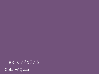 Hex #72527b Color is a normal purple color and the nearest color is Dolphin #646077. Hex code #72527b and RGB value is rgb(114,82,123). In RGB color space, this color is composed of 45% red, 32% green, 48% blue, In CMYK color space, this color is composed of 7% cyan, 33% magenta, 0% yellow , 52% black , In HSL color space, this color has a hue angle of 287° , 20% saturation and 40% lightness.