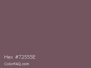 Hex #72555e Color is a normal rose color and the nearest color is Russett #755a57. Hex code #72555e and RGB value is rgb(114,85,94). In RGB color space, this color is composed of 45% red, 33% green, 37% blue, In CMYK color space, this color is composed of 0% cyan, 25% magenta, 18% yellow , 55% black , In HSL color space, this color has a hue angle of 341° , 15% saturation and 39% lightness.